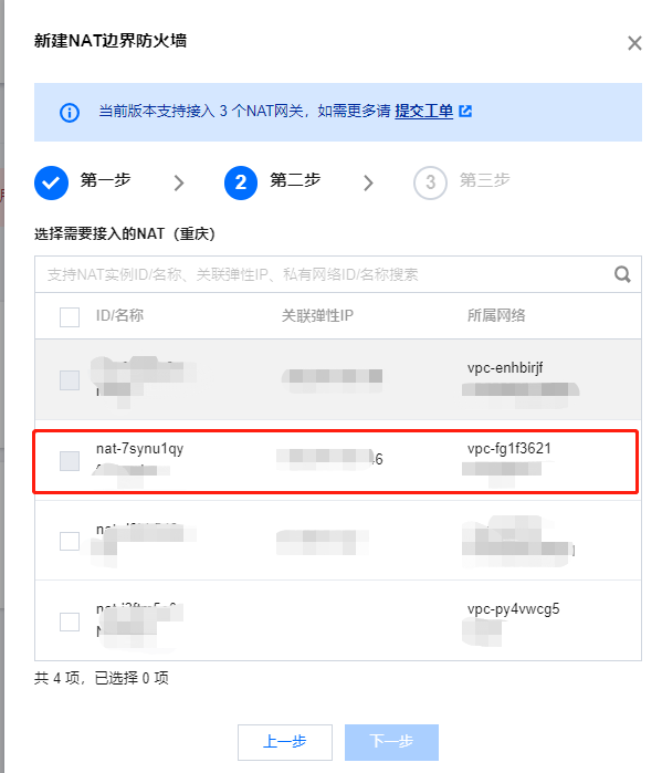 - 勾选需要接入NAT网关的实例ID,点击下一步。