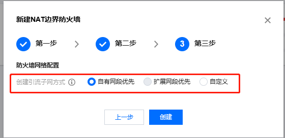 4. 选择引流方式,支持【自有网段优先】、【扩展网段优先】、【自定义】三种引流方式,点击创建,等待实例创建完成。