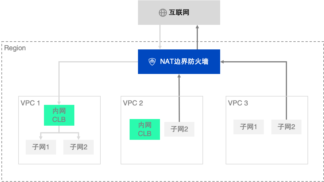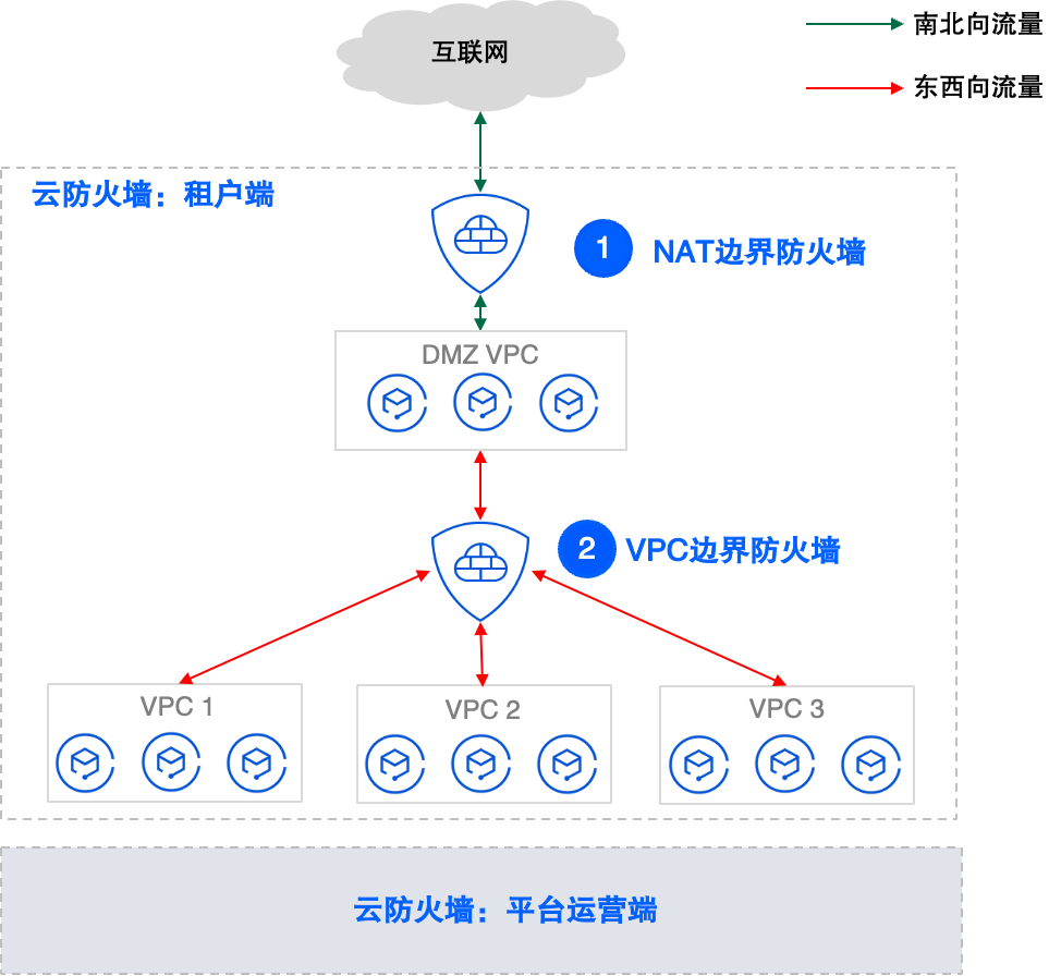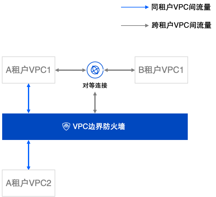VPC防火墙用于防护同租户或不同租户间的VPC间通信流量。