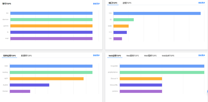 - 查看账号TOP 5、端口TOP5、进程TOP 5、软件应用TOP 5、数据库TOP5、Web应用TOP 5、Web服务TOP5、Web框架TOP 5、Web站点TOP5。