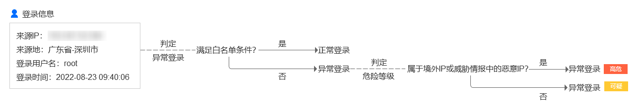 当检测到存在不满足白名单(常用来源 IP、常用用户名、常用登录地、常用登录时间)的服务器登录行为,将产生异常登录告警。若异常登录来源 IP 属于境外 IP(含中国港澳台地区)或威胁情报中的恶意 IP,将被标记为“高危”,反之则标记为“可疑”。