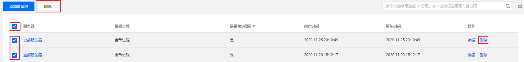 - 删除:在白名单列表中,支持对已配置的白名单进行删除。