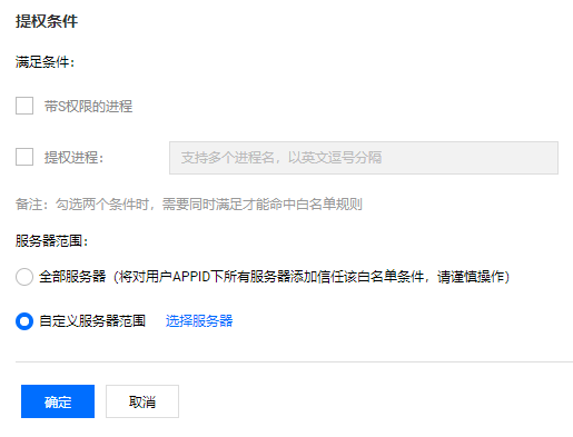 - 在添加白名单页面,设置提权条件,包括:带 S 权限的进程、自定义提权进程(支持多个进程名,以英文逗号分隔,例如 123.exe,test.exe),同时选择该条件覆盖的服务器范围,单击确定。