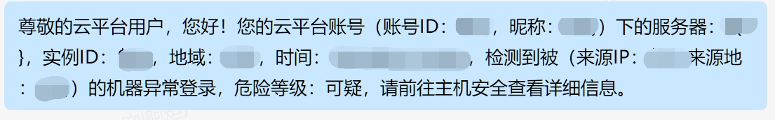 用户接收到腾讯云金融专区发送的服务器被异常登录的消息提醒,如下以短信消息为例: