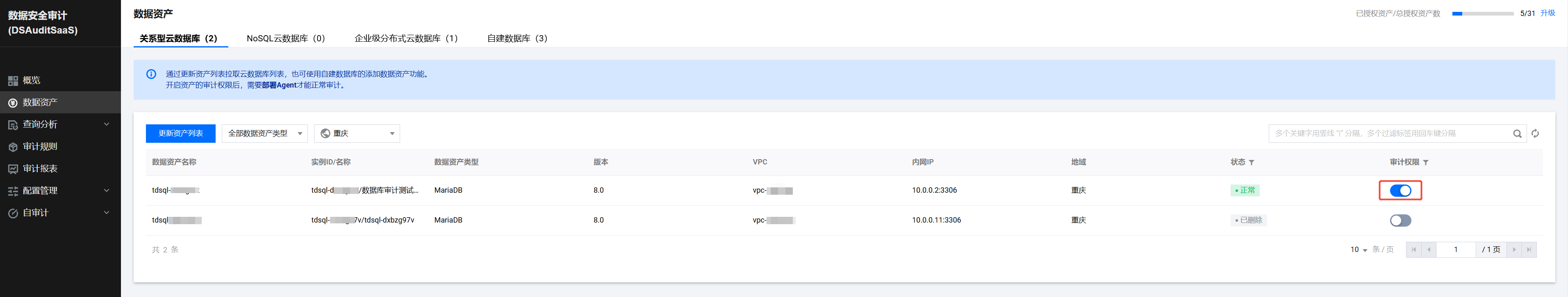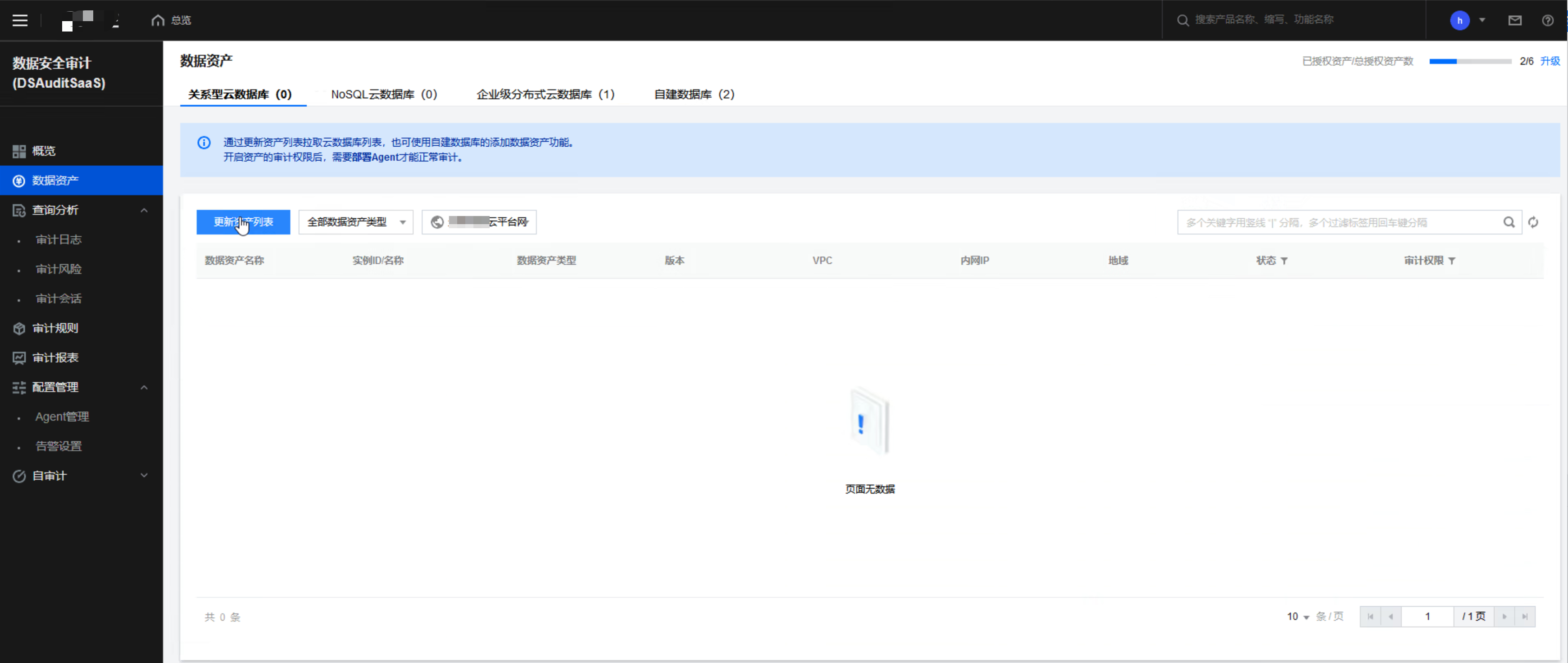 步骤2:通过单击更新资产列表拉取云数据库列表,也可使用自建数据库的添加数据资产功能。