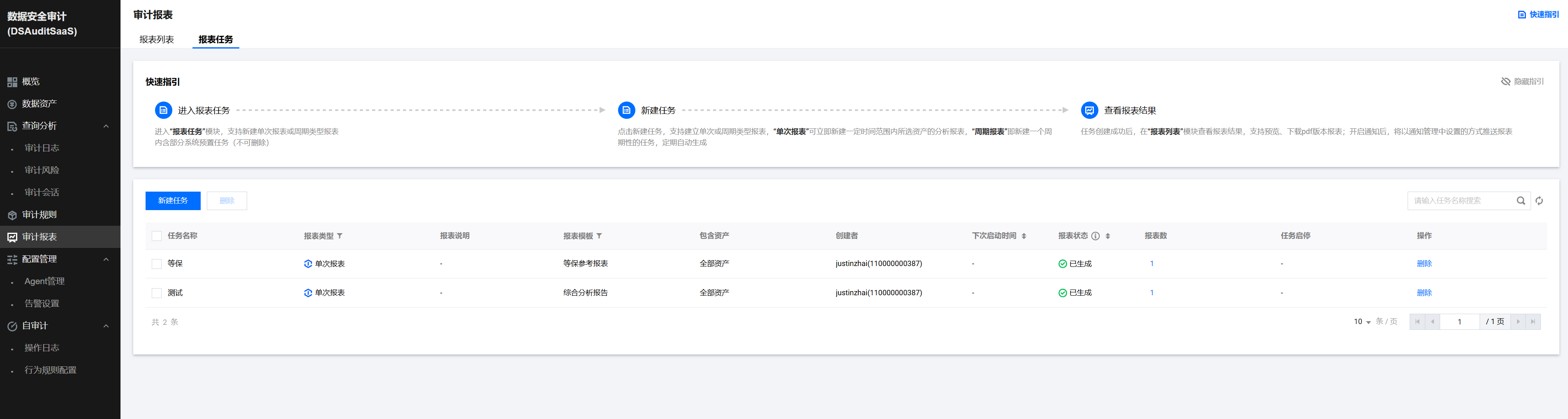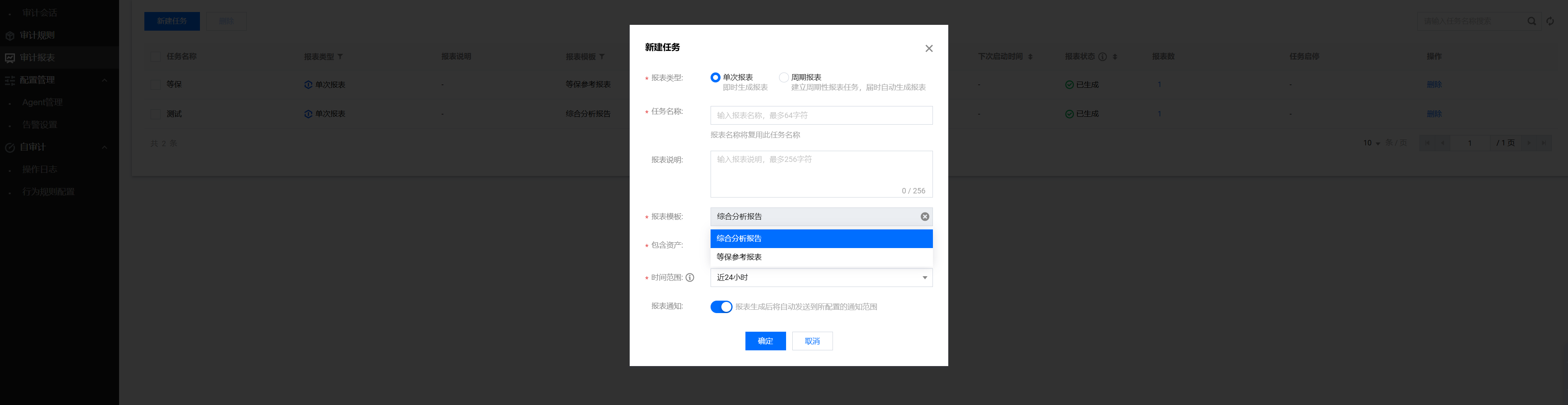 步骤1:在审计报表中创建报表任务生成审计报表,获得周期性的审计报表,了解整体的数据库审计风险状态。
