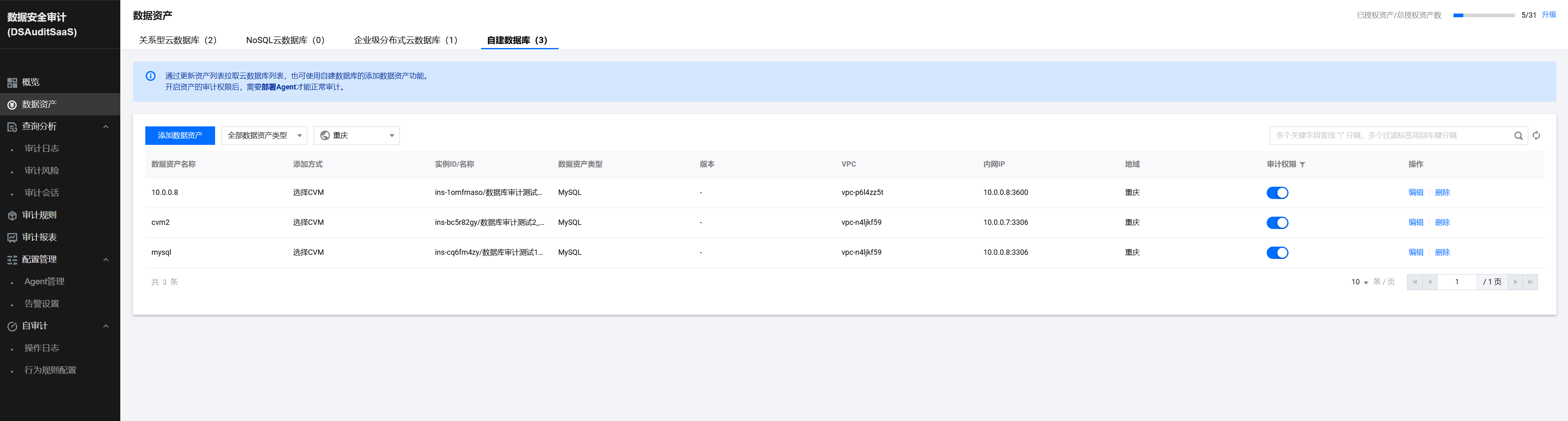 步骤1:进入数据安全审计服务之后,单击侧边栏的数据资产,进入数据资产页面。