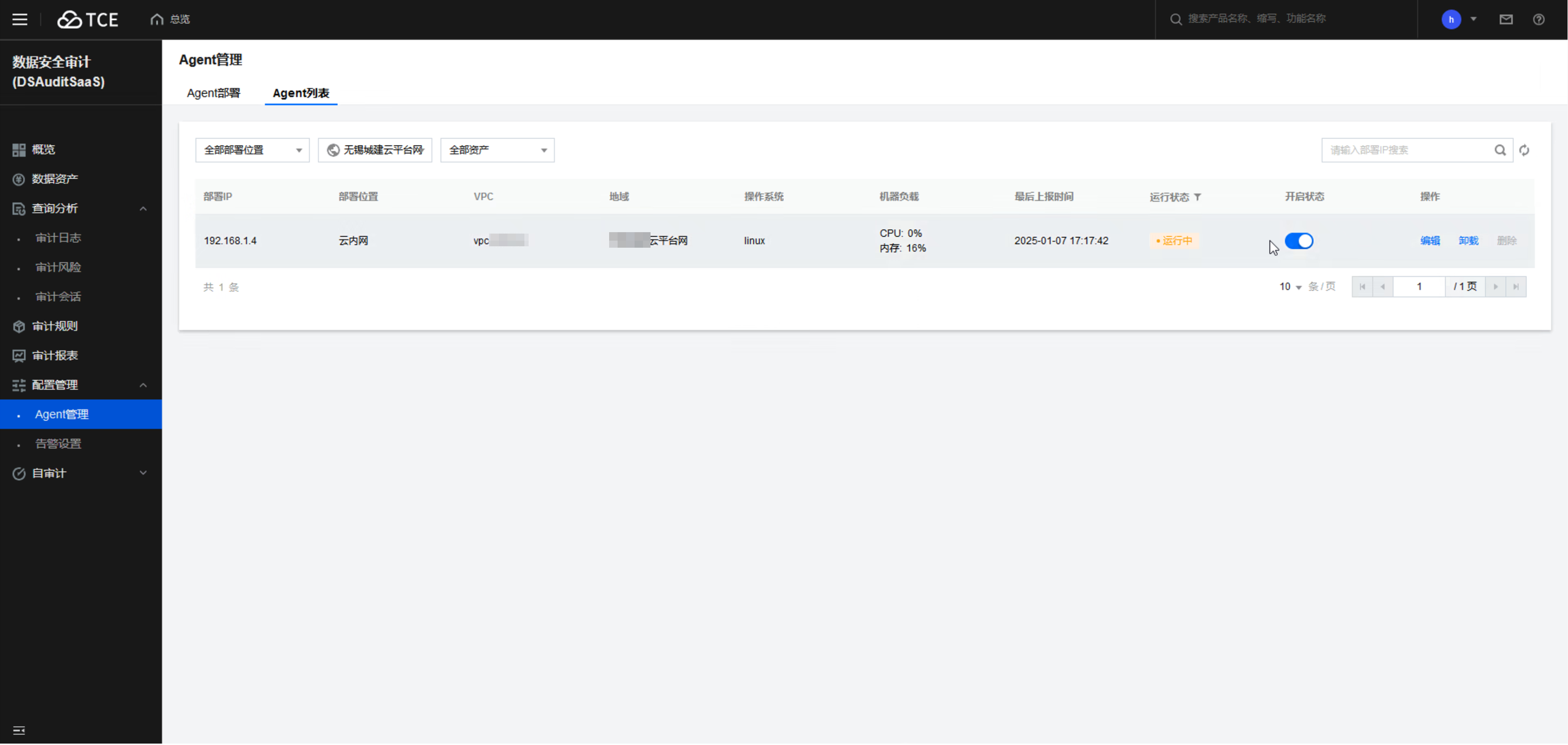 步骤1:Agent 部署完成后,单击 Agent 列表,切换至 Agent 列表页面,验证 Agent 状态是否正常。