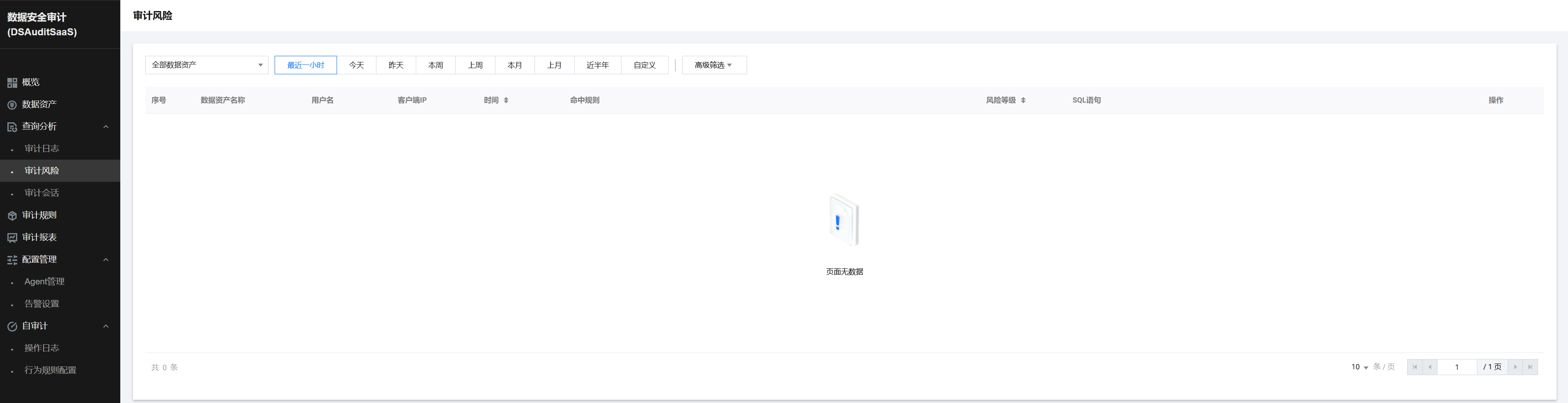 步骤1:在审计风险页面,可查看发现的数据安全风险,安全管理人员可根据风险提示,判断是否需要采取进一步措施。并可通过时间筛选或通过高级筛选进行特定信息的查询。