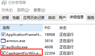 步骤4:检查 CapAgentForWin 是否成功启动并连接审计服务成功,在任务管理器中确认CapAgentForWin 进程已运行。