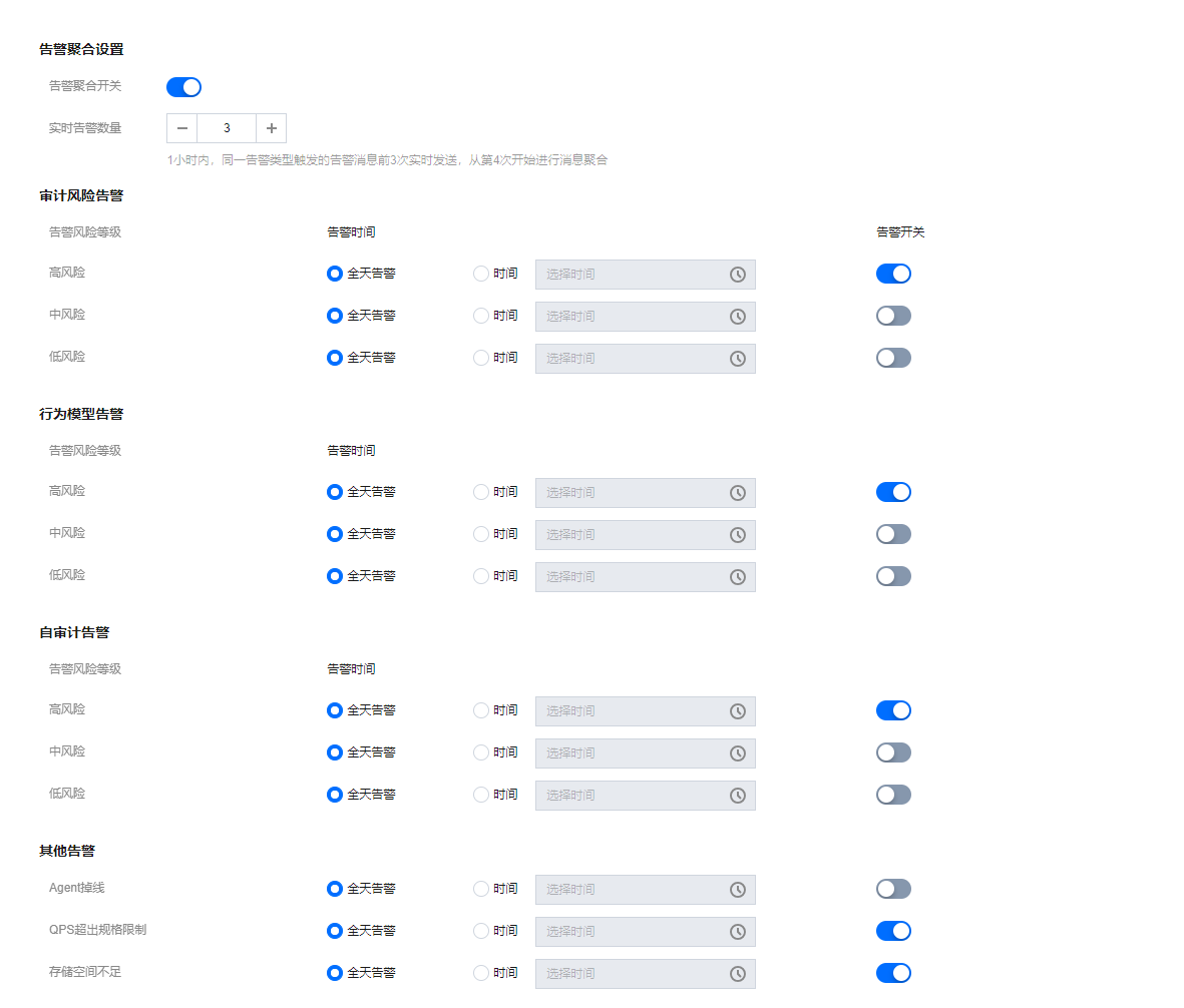 - 告警聚合设置:为应对告警风暴,您可以通过设置实时告警数量,将一小时内超过阈值的多个告警事件进行聚合通知。