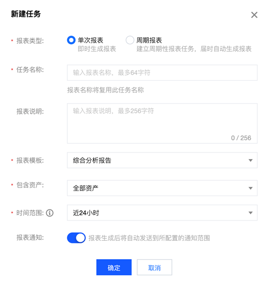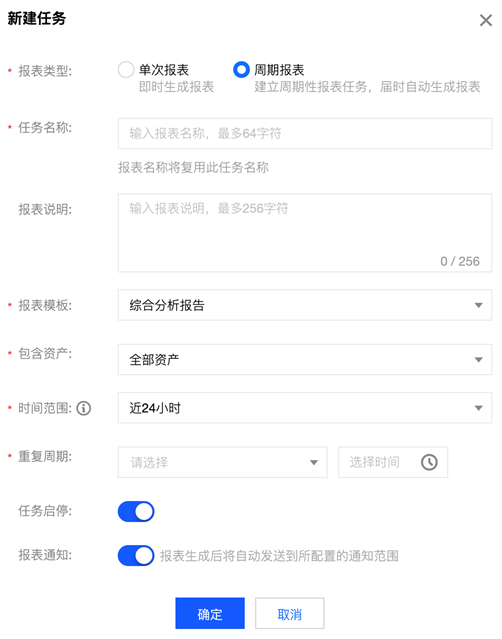 - 在新建任务弹窗中,可选择单次报表或周期报表,并配置相关参数。