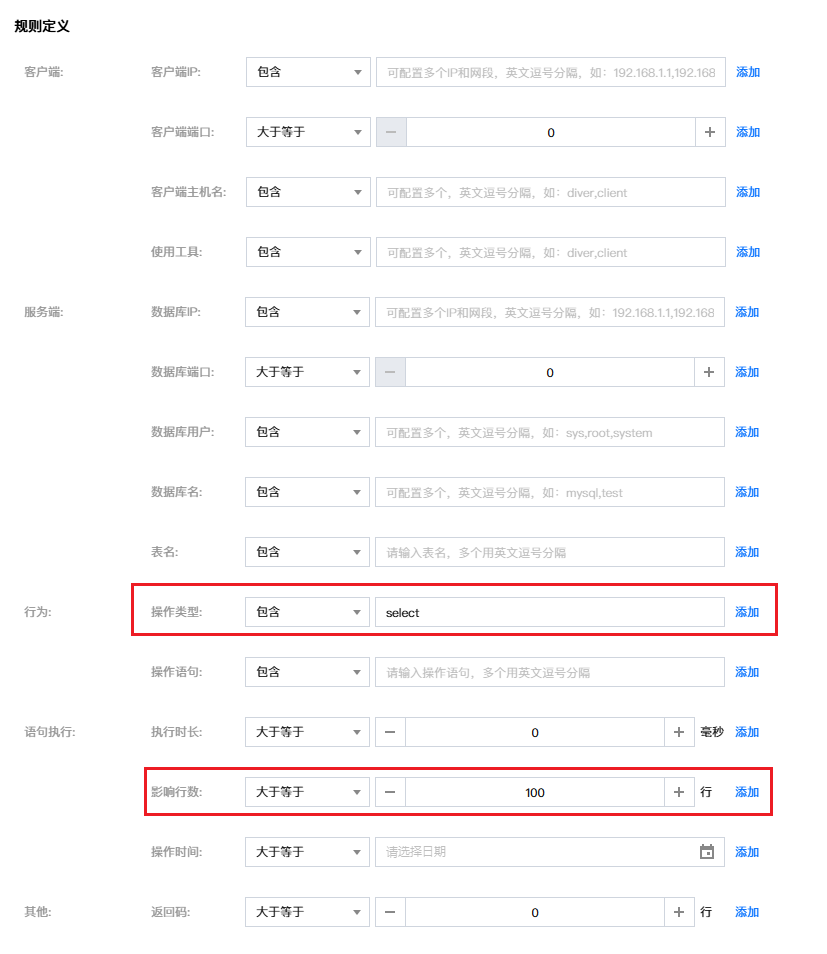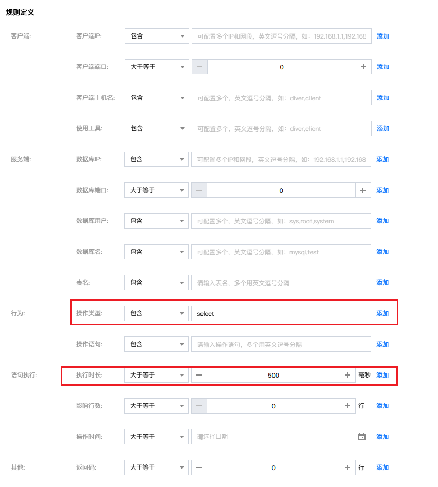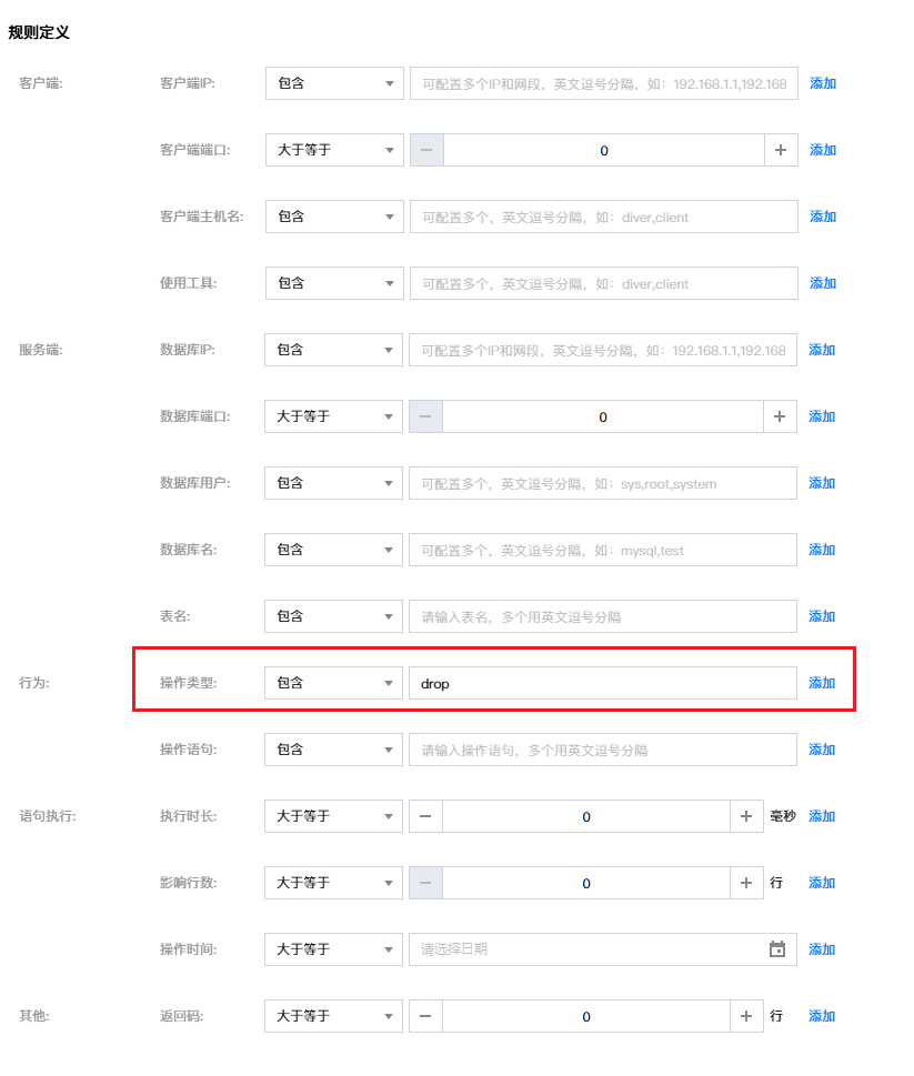 | 黑名单 | 用于检测数据库操作中的异常行为,当出现不符合正常操作模式的行为时触发告警。 | 使用风险识别规则检测异常操作。审计记录命中配置并启用的风险识别规则时,会触发告警。 |