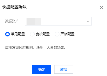 - 在快捷配置弹窗,选择需要快捷配置规则的资产(也可选择所有资产),并选择适合的快捷配置组,单击确定即可完成配置,配置后将覆盖当前该资产的规则启用配置。