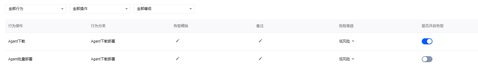 在行为规则配置页面,显示行为操作、行为分类、告警模板、备注、危险等级及是否开启告警。您可根据行为分类、行为操作及危险等级搜索查看相关配置信息。