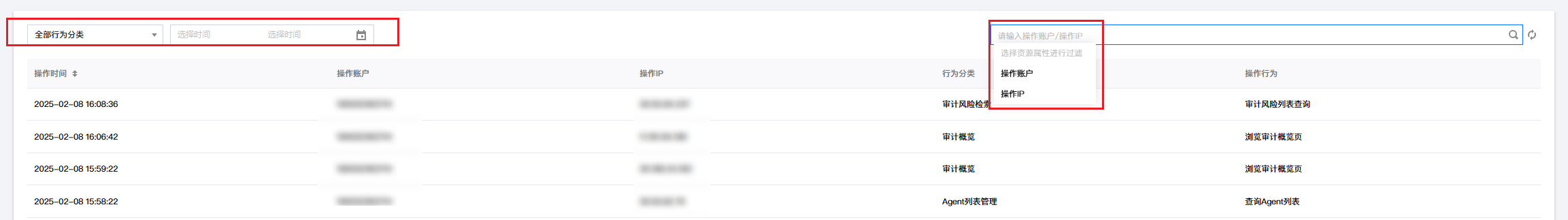 - 在操作日志页面,您可以根据行为分类、操作时间、操作账户、操作 IP 检索查看操作完整信息。