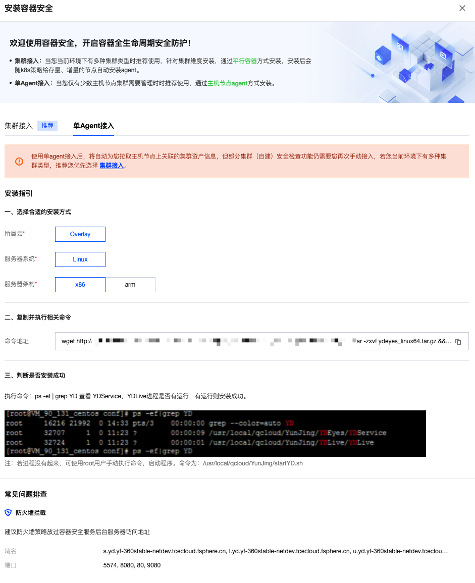 - 在资产管理页面,单击容器的主机节点 > 安装容器安全服务 Agent,在右侧弹窗中查看安装指引详情。