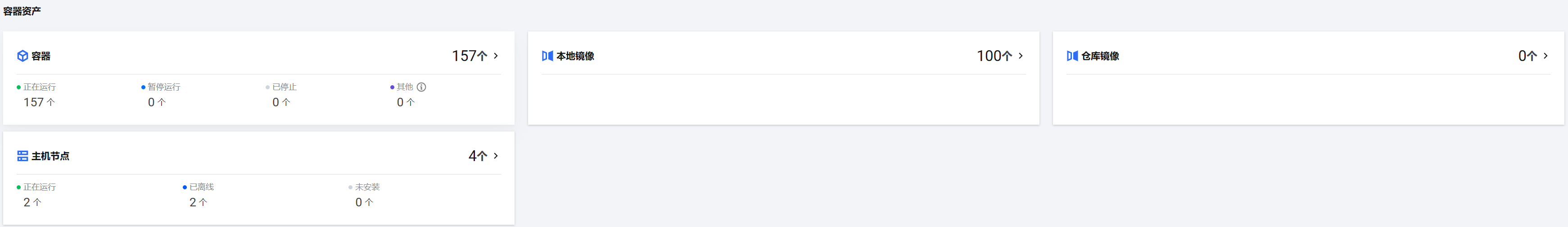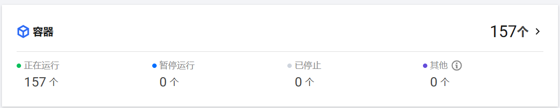 容器展示模块中提供容器资产总数,以及正在运行、暂停运行、停止运行、其他容器的数量。