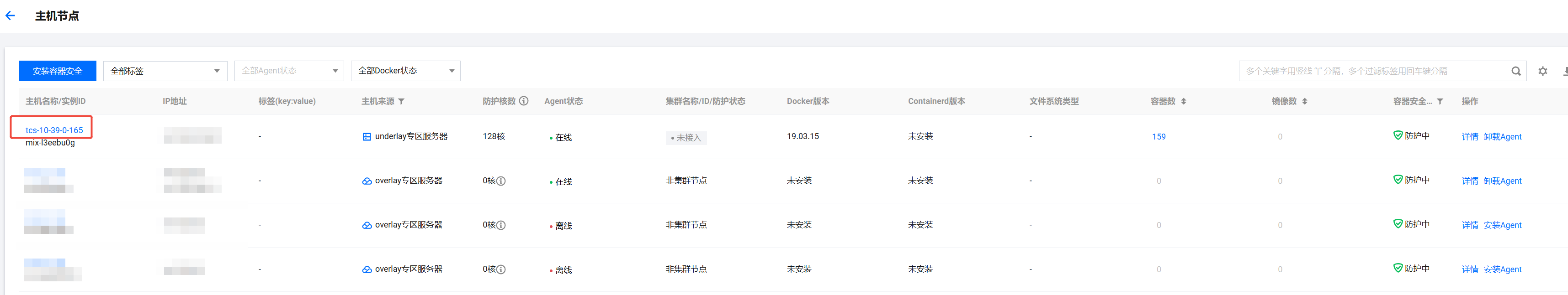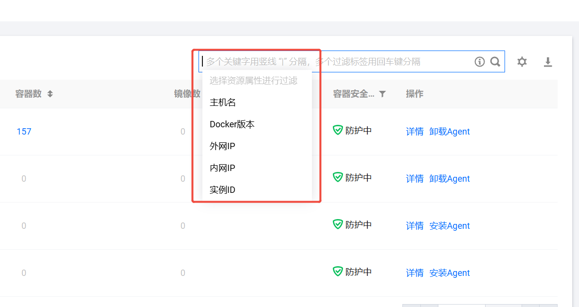 - 容器安全防护:展示容器防护状态,防护中或未防护。