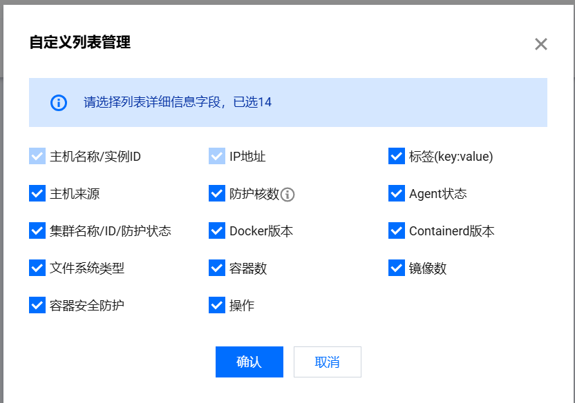 3.在主机列表页面,单击设置图标,弹出自定义列表管理弹窗,在弹窗中可以自定义设定列表管理。