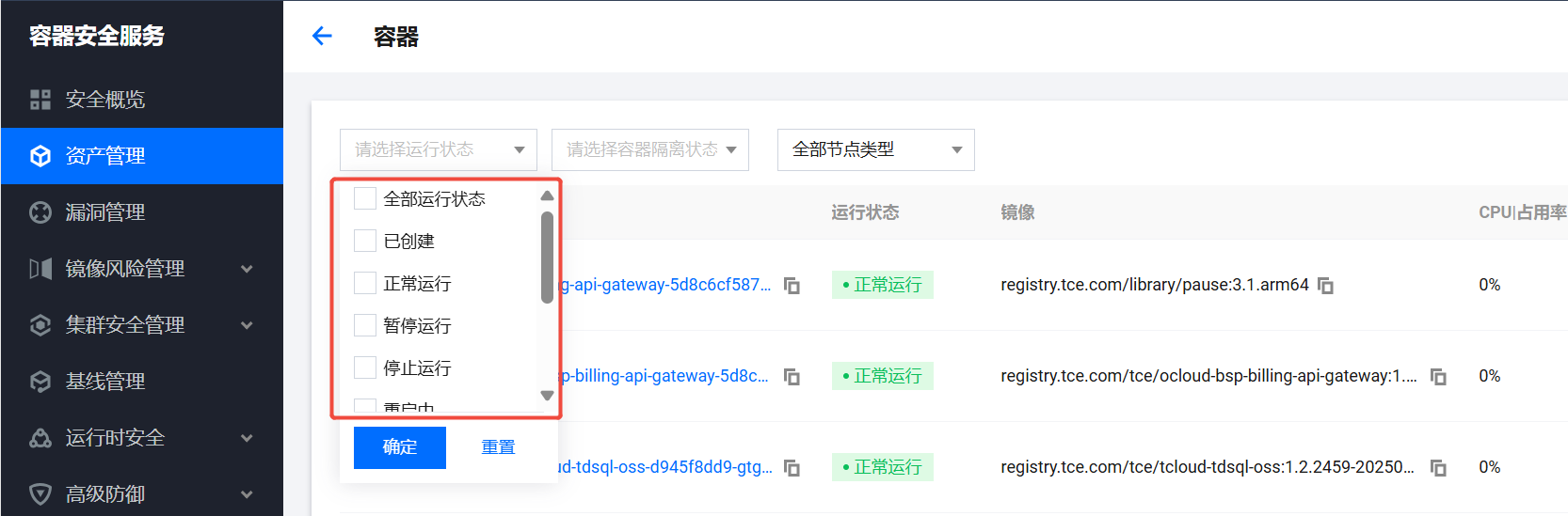 - 单击左上角的状态下拉框,按运行状态对容器资产进行筛选。