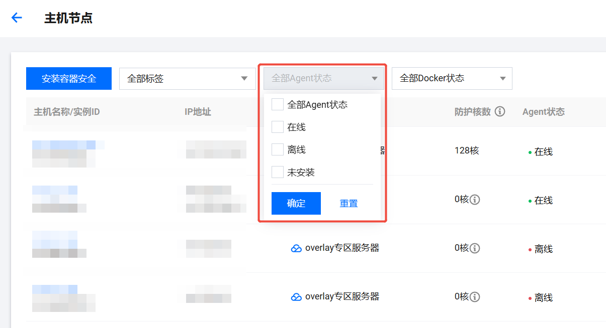 - 在主机列表页面,可按主机状态对主机资产进行筛选,或搜索框通过“主机名、业务组、docker 版本、主机 IP”等关键字对主机进行查找。