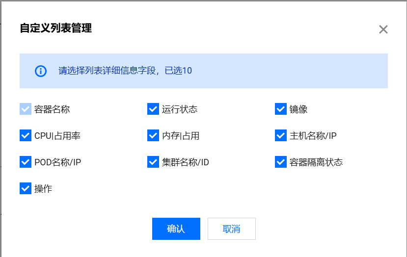 3.在容器列表页面,单击设置图标,弹出自定义列表管理弹窗,在弹窗中可以自定义设定列表管理。