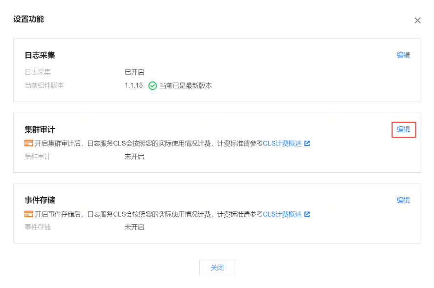 在设置功能页面,点击集群审计功能的编辑按钮。