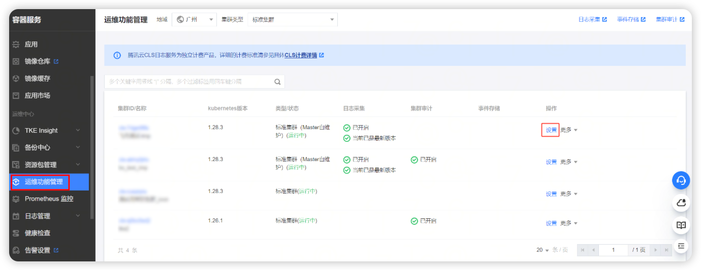 进入容器服务控制台,在运维功能管理页面,选中需要开启audit的集群,点击设置按钮。