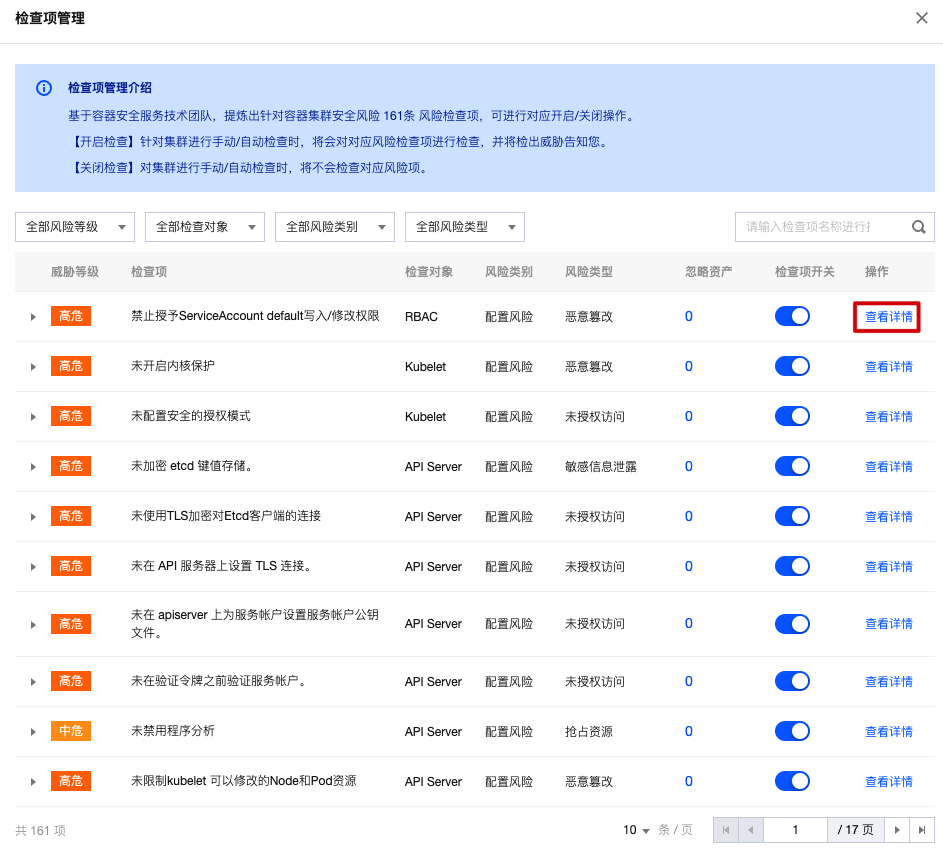 - 在检查项设置页面,检查项列表展示了系统执行集群检查的所有检查项,单击查看详情可查看检查项的详细信息。