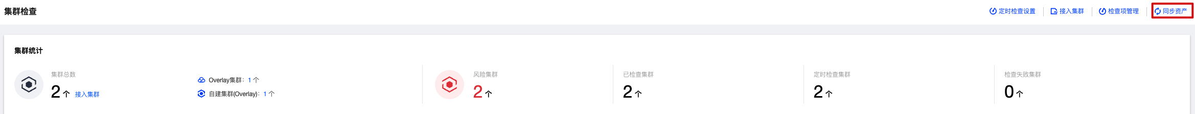 - 在集群检查页面,已内置每1小时定期同步集群资产;单击同步资产,可进行手动同步集群资产。