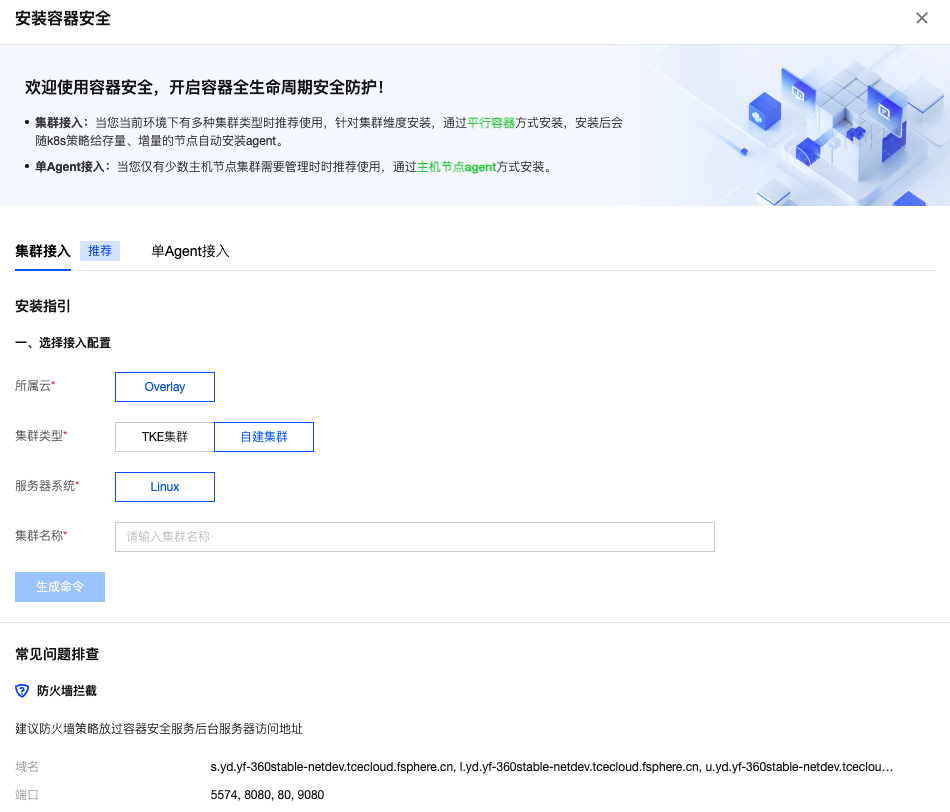 - 单个:选择所需集群 ID,单击接入集群,弹出安装容器安全窗口。