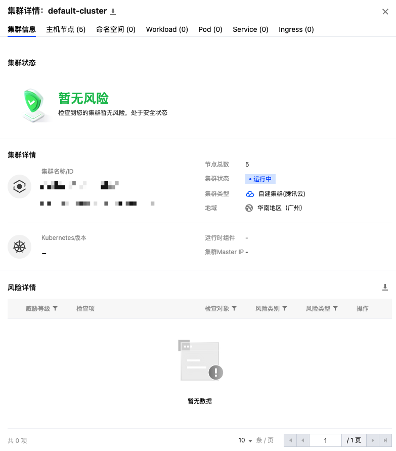 - 在“集群风险详情”页面,展示了当前集群所有被检出的集群风险、集群详情和风险详情。