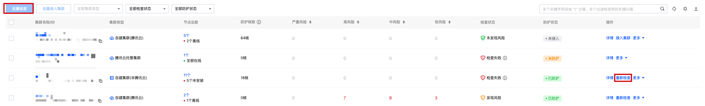 在集群检查页面,检查组件安装成功后系统会自动执行一次集群检查,您也可指定集群单击重新检查或指定多个集群单击批量检查执行集群检查。
