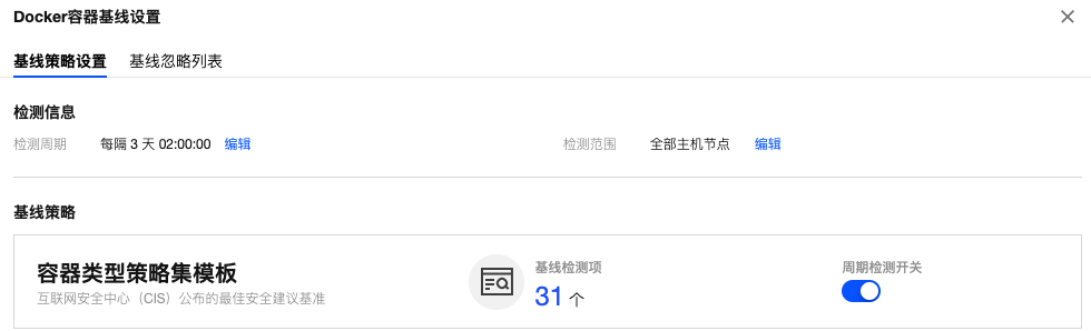 - 在容器页面,单击基线设置,可设置基线策略和基线忽略列表。
