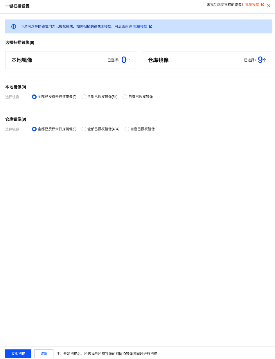 • 需要先对镜像完成授权方可进行镜像检测。
