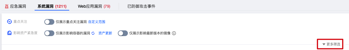 1. 单击更多筛选,支持通过威胁等级、是否可修复、风险标签、CVE 编号、影响镜像 ID、影响镜像名称、影响容器 ID、影响容器名称、漏洞组件版本、漏洞组件名称搜索相关漏洞。