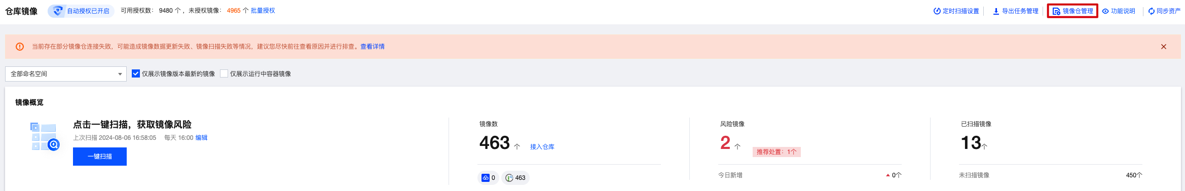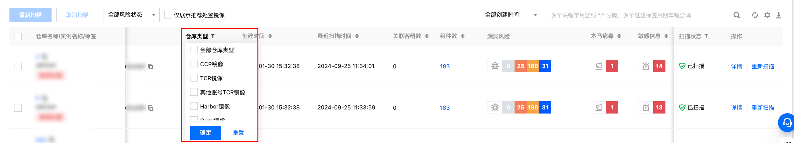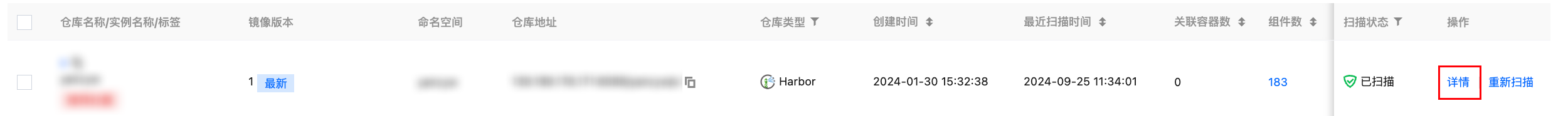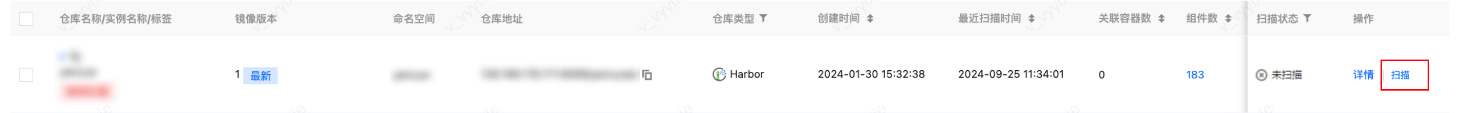 - 在仓库镜像页面,单击右侧一键扫描,可获取最新镜像数据或镜像风险信息。