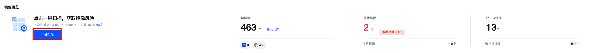 在 [仓库镜像页面] 扫描数据展示模块中提供最近扫描检测后的存在风险的镜像数量和镜像总数,镜像存在的安全漏洞、木马病毒和敏感信息数量。