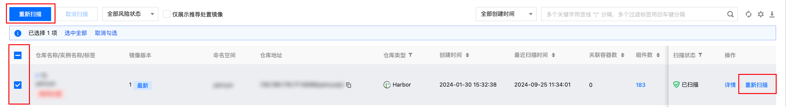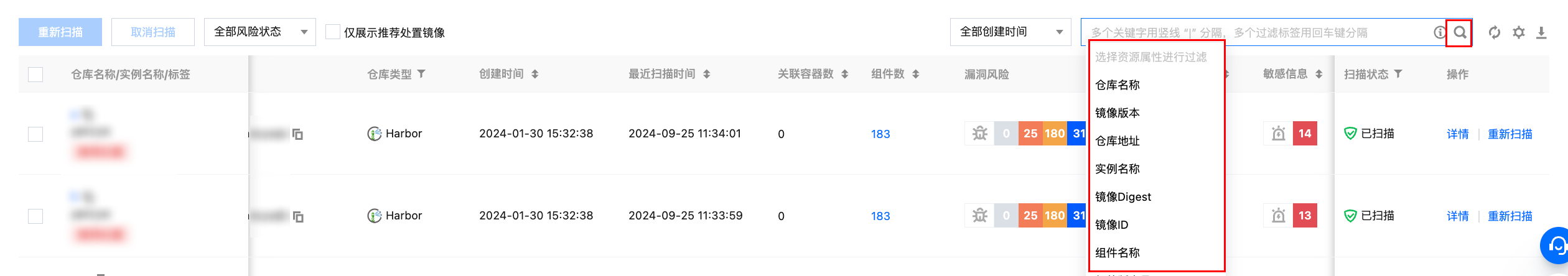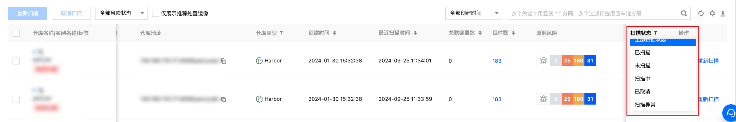 在仓库镜像页面,上一个扫描任务停止后,单击重新扫描,对镜像重新扫描。