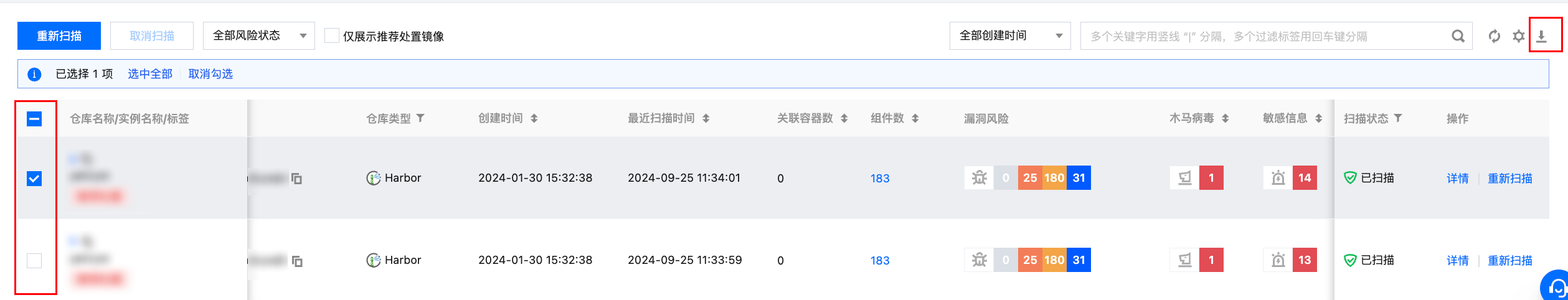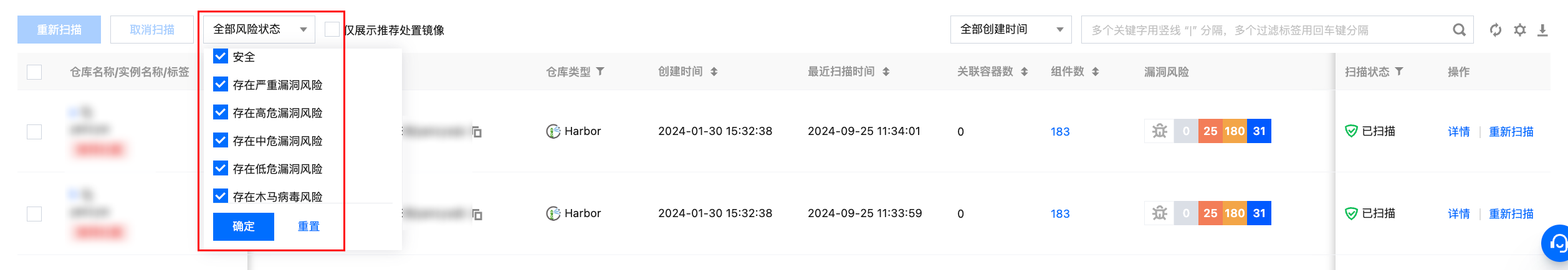 勾选多个镜像后,单击重新扫描进行批量重新扫描。