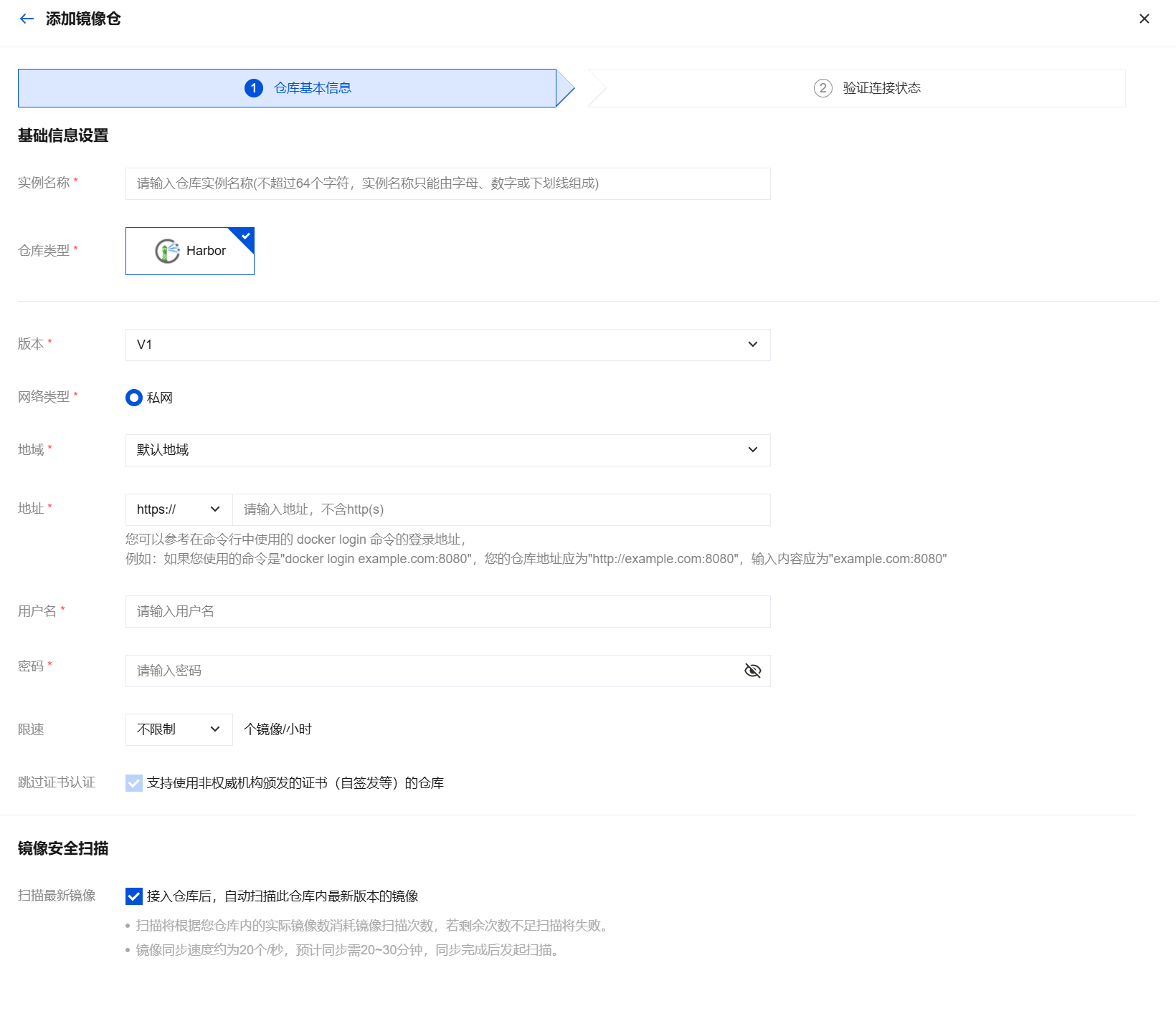 | 地域 | 选择第三方镜像仓库所在区域,Harbor 类型为默认值“默认地域”。 |