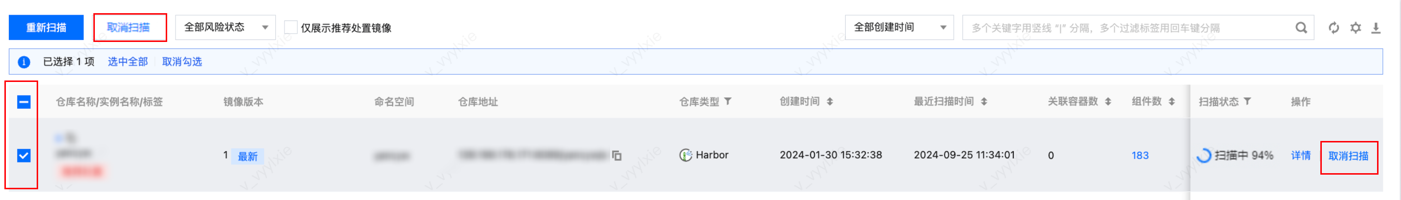 在仓库镜像页面,镜像扫描状态为“扫描中”时,单击取消扫描,取消扫描镜像。