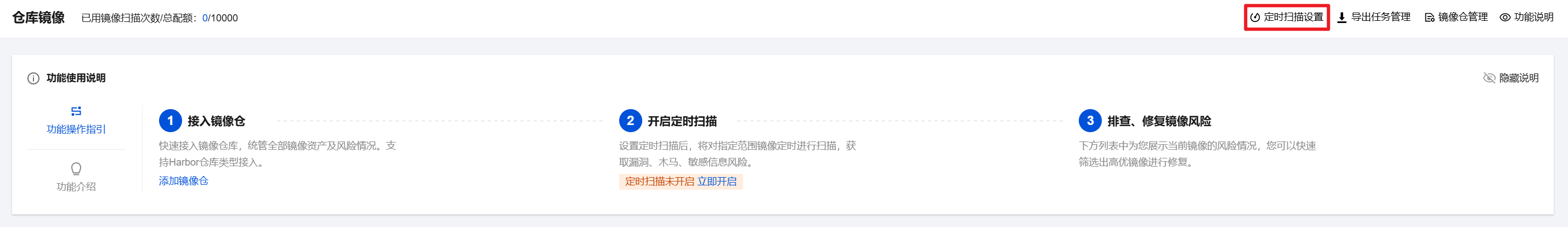 - 在仓库镜像页面,单击右侧定时扫描设置,可自定义设置是否开启定时扫描功能。