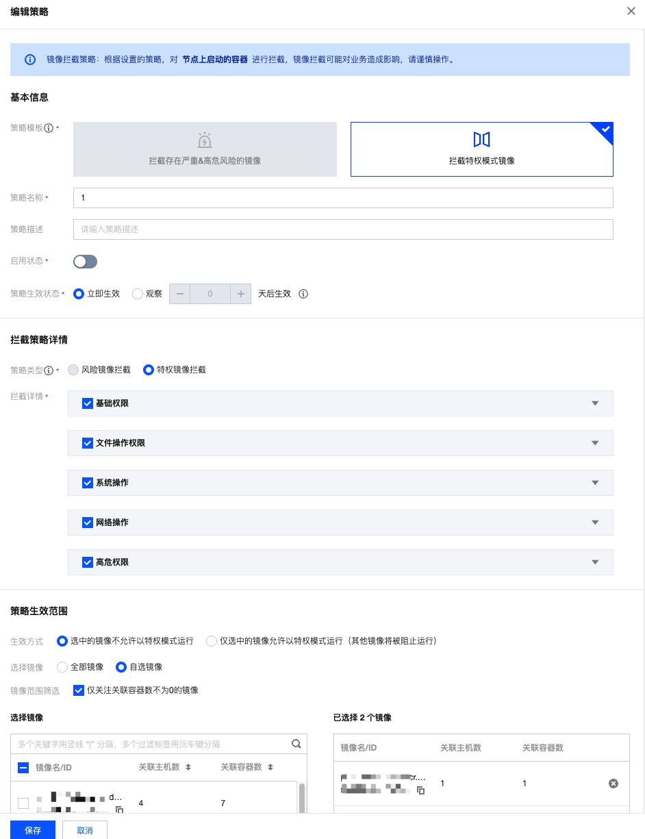 • 拦截特权模式镜像仅支持配置一条规则,如需修改拦截镜像的范围,可编辑调整已配置规则。