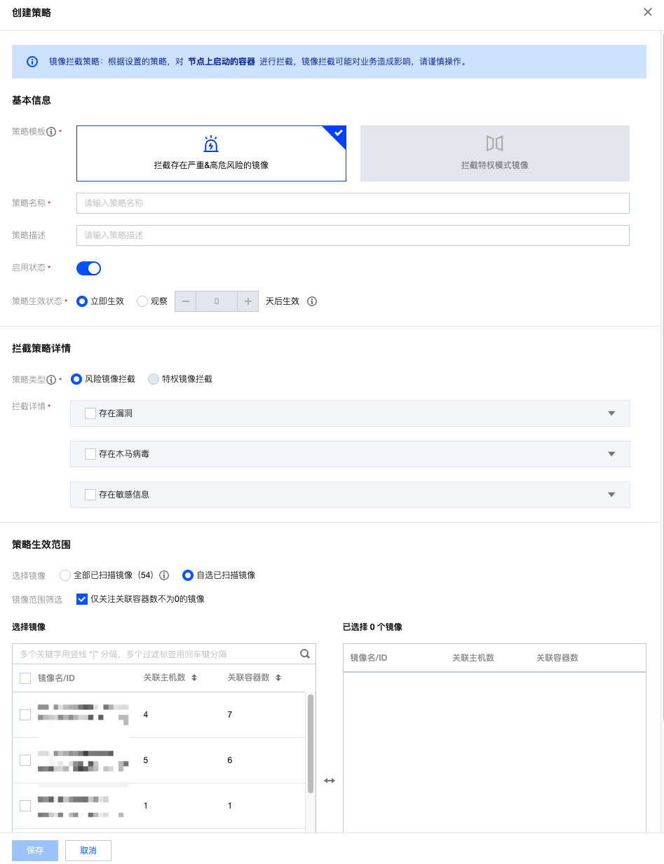 • 新建风险镜像拦截策略