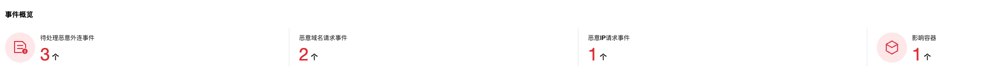 - 在事件列表页面的事件概览中,将根据系统上报的安全事件,实时统计待处理的恶意外连事件及其影响的容器数量。