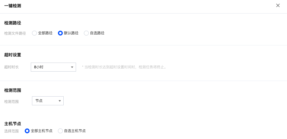 - 在一键检测页面,选择检测路径、检测范围,并设置超时时间。