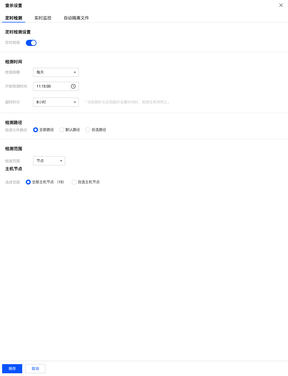 - 在定时检测设置页面,单击开启开关,开启定时检测,并依次设置检测时间、检测路径、检测范围。