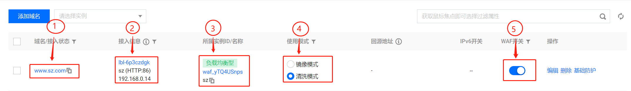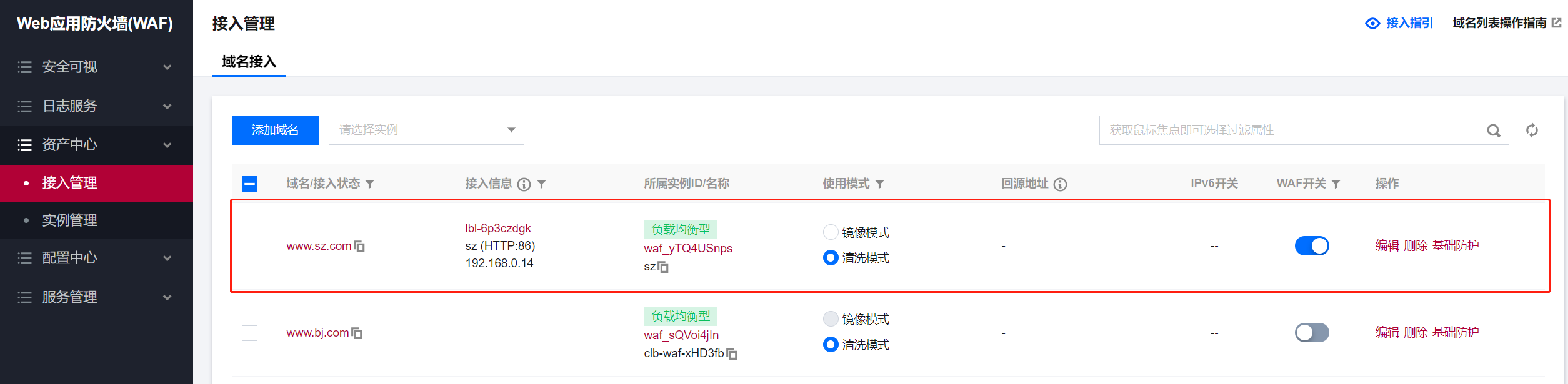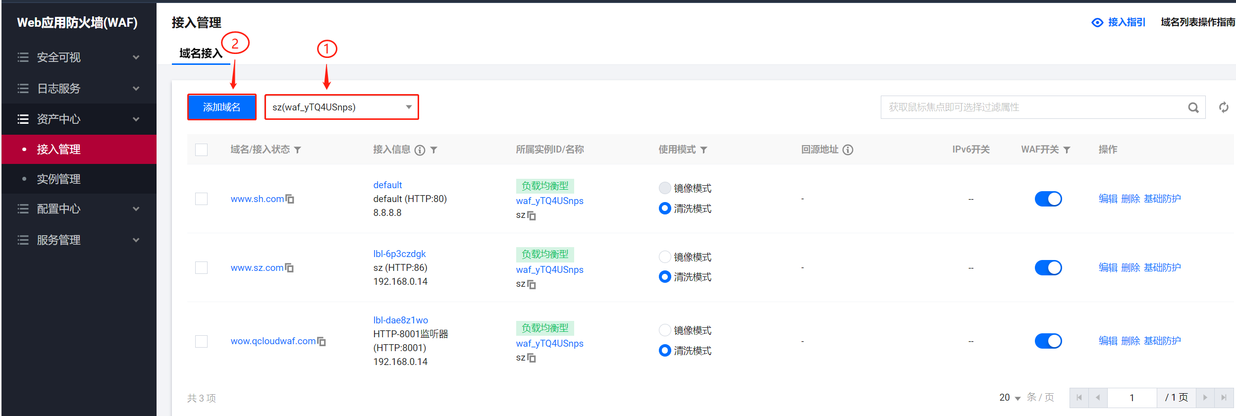 - 登录租户端WAF-资产中心-接入管理页面,先选择实例,然后点击添加域名。